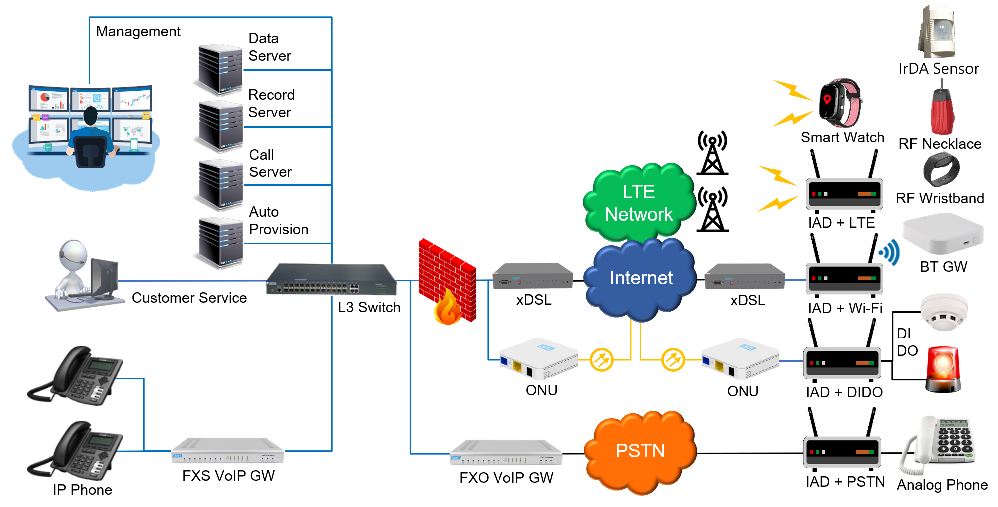 前端使用者可以选择各种连线方式取得24 x 7 的照护服务,包括xDSL、Fiber、LTE。
